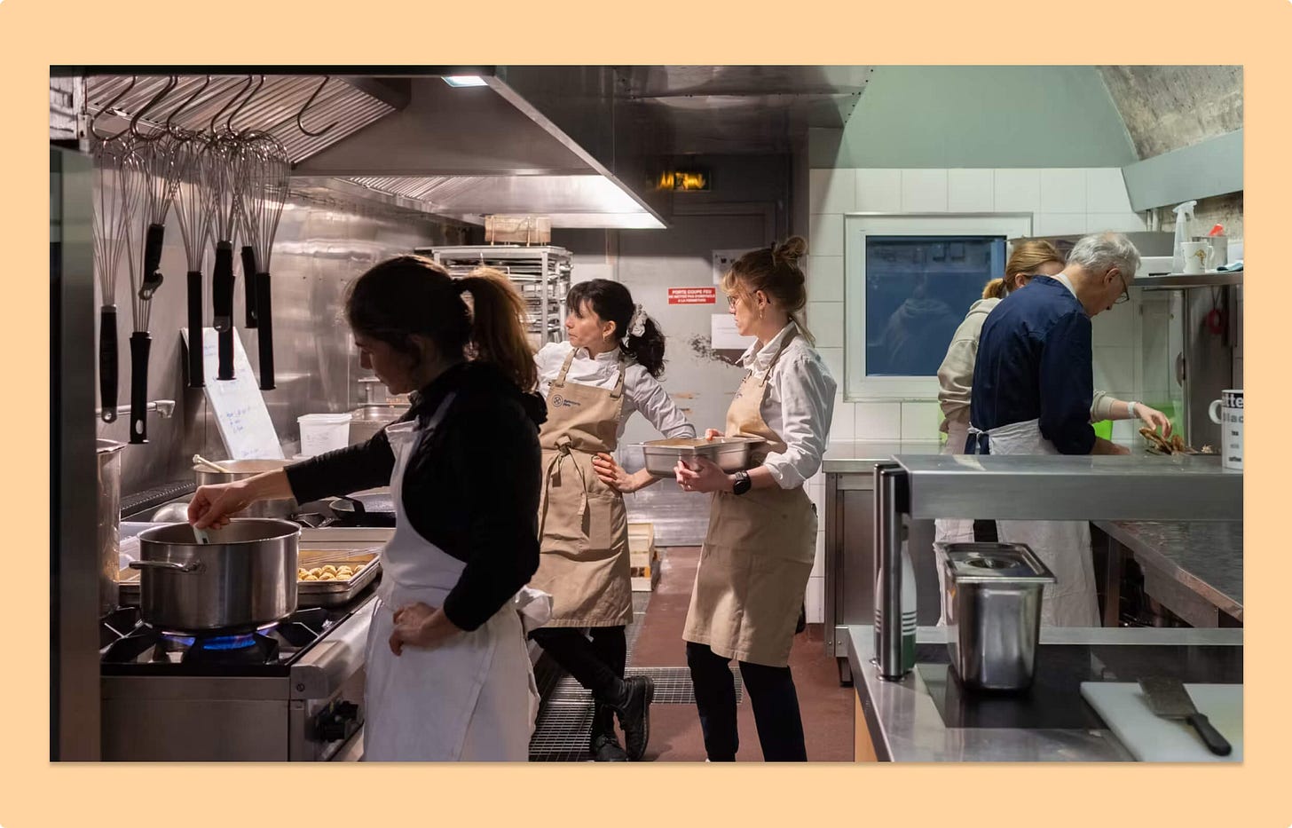 🧘 Moins de pression, plus de rituels collectifs — Au restaurant solidaire le Refettorio, les équipes travaillent avec des horaires maîtrisés et une ambiance de travail apaisée : on évite les ordres arbitraires et la pression hiérarchique traditionnelle en cuisine. Le management est volontairement horizontal : tutoiement, consignes adaptées selon les situations des salariés, briefing collectif avant chaque service, pause obligatoire de 20 minutes et séance d’étirements après service. Des rituels concrets pour le bien-être physique des équipes.